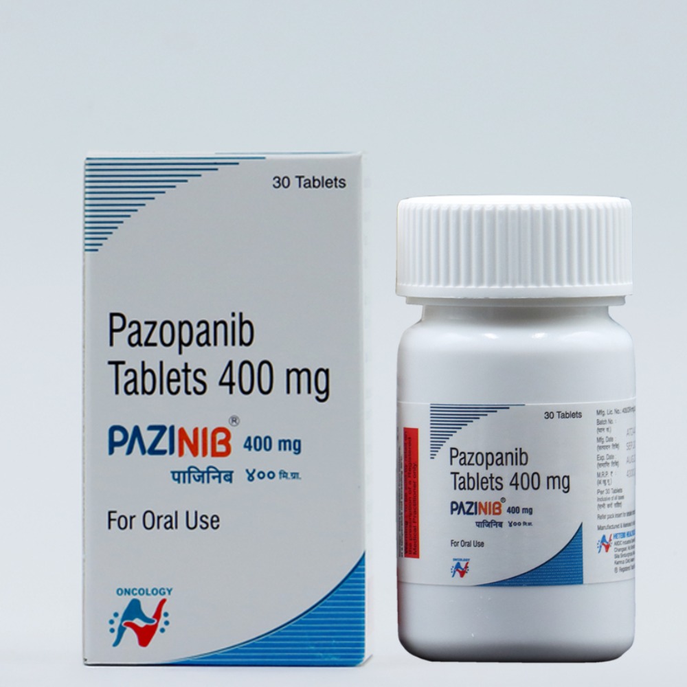 Pazinib Pazopanib 400 mg Tablets contain Pazopanib, a targeted anti-cancer medication used in the treatment of certain types of cancers. It belongs to a class of drugs known as tyrosine kinase inhibitors (TKIs), which work by blocking proteins responsible for tumor growth and blood vessel formation (angiogenesis). This helps slow down or stop the spread of cancer cells in the body.